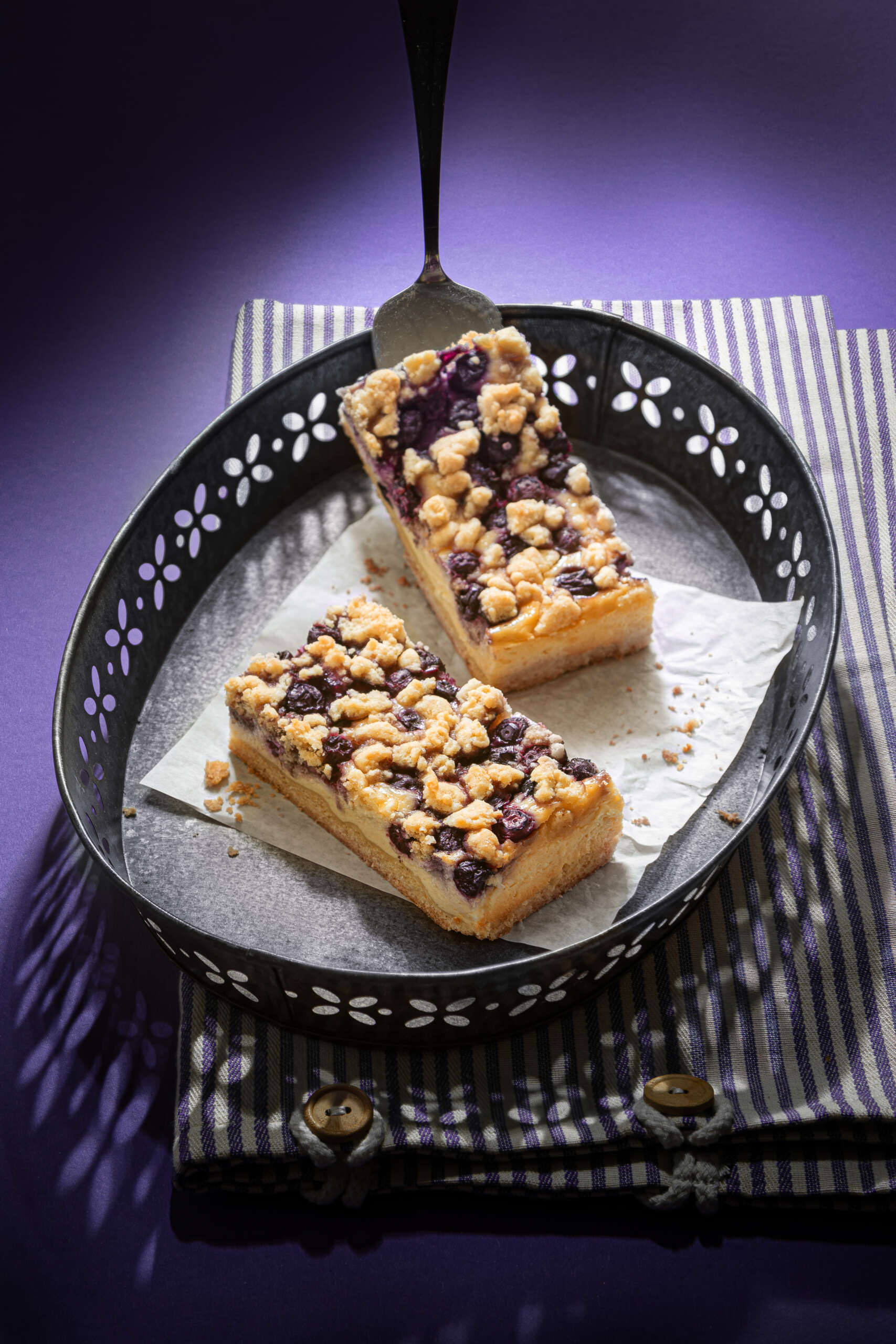 - Heidelbeeren auf der Masse verteilen. Den Teig aus dem Kühlschrank zu Streuseln verarbeiten und ebenfalls überstreuen.
