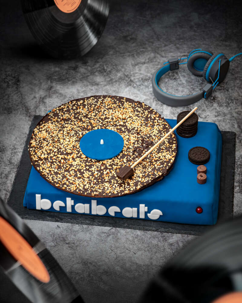 - Für das Kabel ein Loch an der einen Seite des Blockschokoladen-Blocks bohren. Aus Weingummis und Fondantresten Schalter und Regler formen und auf die Blockschokolade aufbringen. Blockschokolade auf die Schräge des Verstärkers setzen, rundherum mit einem Messer in die Torte stechen, Material ca. 1 cm tief entnehmen und Blockschokolade in das Loch setzen.